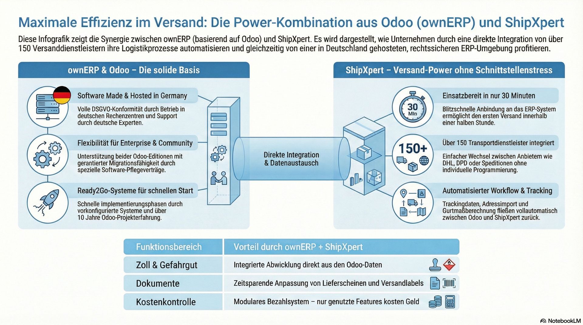 - Dies ergibt für Sie eine rechtssichere Kette von der Bestellerfassung in Odoo bis zum Versandlabel – alles nach deutschen Standards und mit deutschsprachigem Support.
